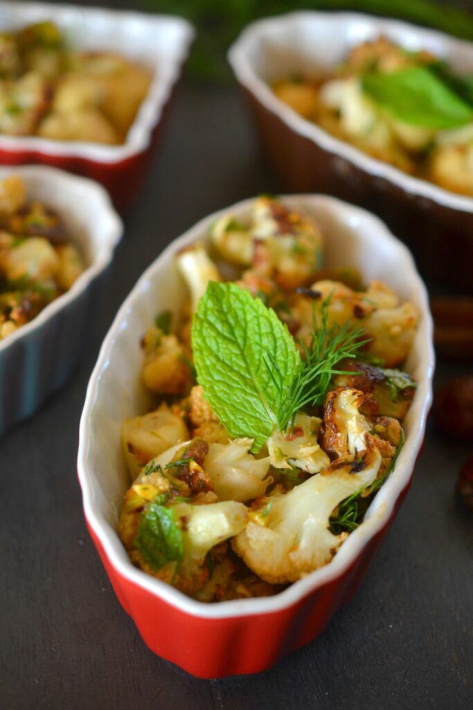 1. Kalafior Pieczony z Kurkumą, Daktylami, Pistacjami, Miętą i Cytryną (Wegański / Bezglutenowy)