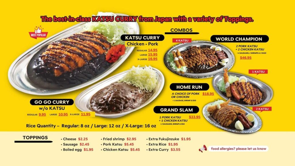 Jedną z ich flagowych pozycji, stworzoną z myślą o osobach z naprawdę dużym apetytem, jest „World Champion Curry”. To gigantyczne danie, kosztujące 2550 jenów, zawiera kiełbaski, krewetki oraz zarówno kurczaka, jak i kotlet wieprzowy, a wszystko to podane na dużej porcji ryżu i obficie polane sosem curry. Jest to prawdziwa uczta dla oczu i podniebienia, symbolizująca hojność i sytość, za którą Go Go Curry jest tak cenione. To danie to nie tylko posiłek, ale wyzwanie i doświadczenie, które pozostaje w pamięci na długo, potwierdzając reputację Go Go Curry jako miejsca, gdzie liczy się smak i obfitość.