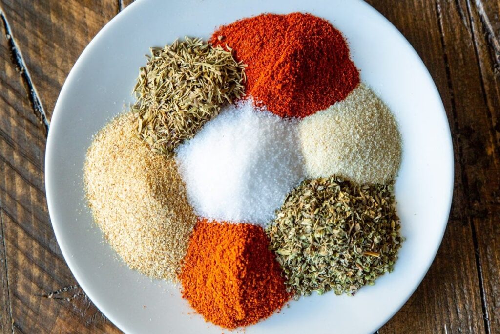 - Składniki: Jest dość pikantna (dzięki pieprzowi cayenne lub chili w proszku), ale zawiera również aromatyczne zioła, takie jak oregano, tymianek i bazylia.
