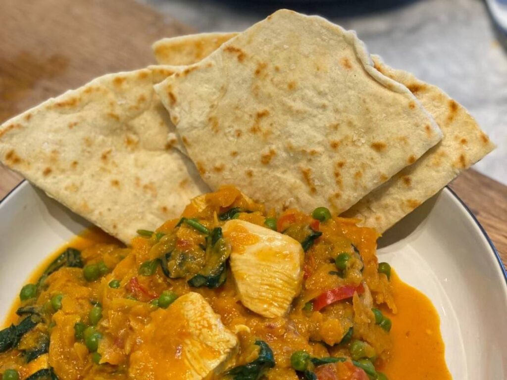 | Curry + 1 mały chlebek pita/flatbread | ~350-400 kcal | Lekka opcja, idealna do wycierania sosu. |